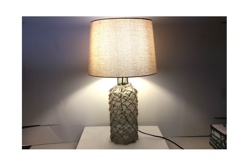 Lámpara decorativa en botella de cristal de color verde y pantalla de tela traslúcida. Bombilla E27. Diametro botella: 14 cms Fotografías tomadas con bombilla led de 4w y 2700K