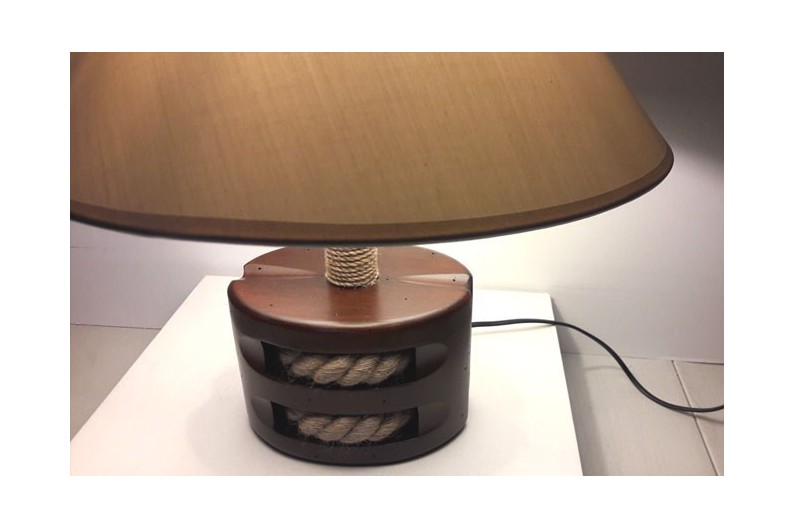 Lámpara polea. Lámpara de decoración marina en forma de polea doble, en madera, patinada a la antigua. Una cuerda gruesa de cáñamo decora las roldanas. Se entrega con la pantalla.