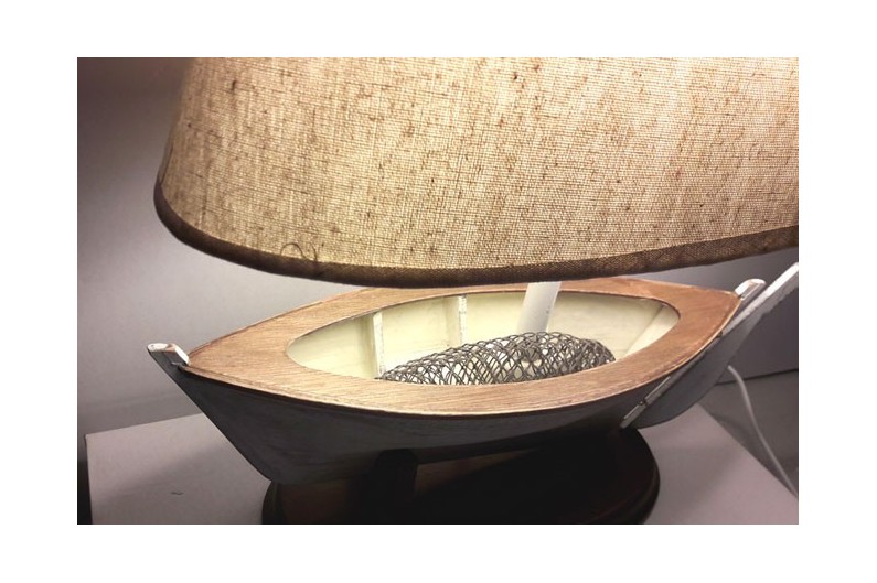 Lámpara barco. Original lámpara náutica realizada a partir de un casco de barco del cual se alza su vela. Fabricada y pintada a mano. Se entrega con la pantalla.