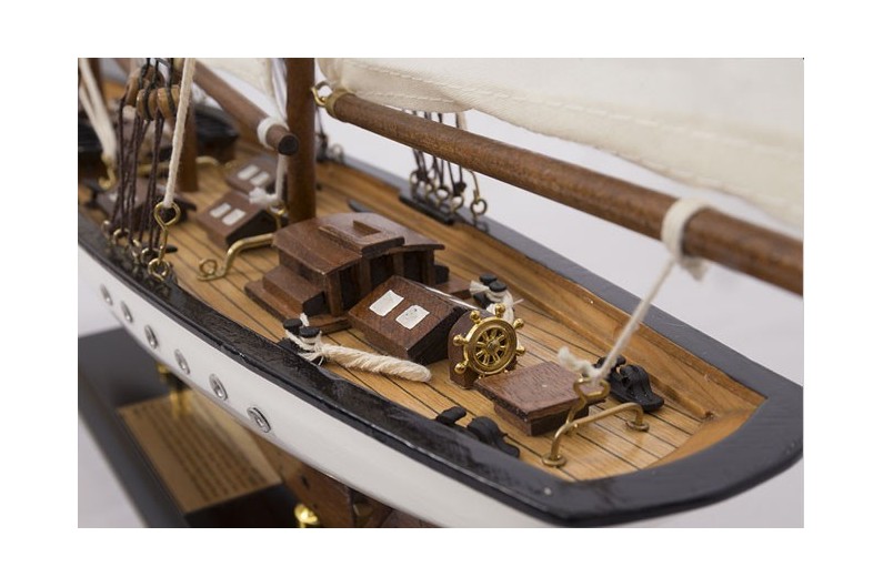Maqueta de barco Atlantic (1903), una goleta de tres palos diseñada por William Gardner. Acabó como buque-escuela de Estados Unidos para los Guardacostas. La maquetas está fabricada y pintada a mano. El mástil viene desmontado para su transporte.