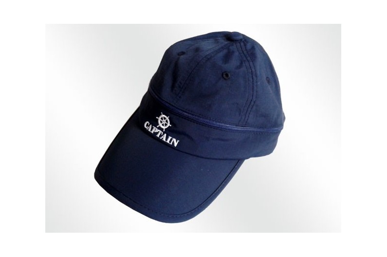 Gorra de capitán de color azul, con logo de capitán bordado en blanco. Diseñado con aperturas de ventilación que garantizan la aeración de la cabeza. También dispone de un sistema de cremallera para separar la parte superior de la gorra y convertirse en visera. Ajustable por detrás.