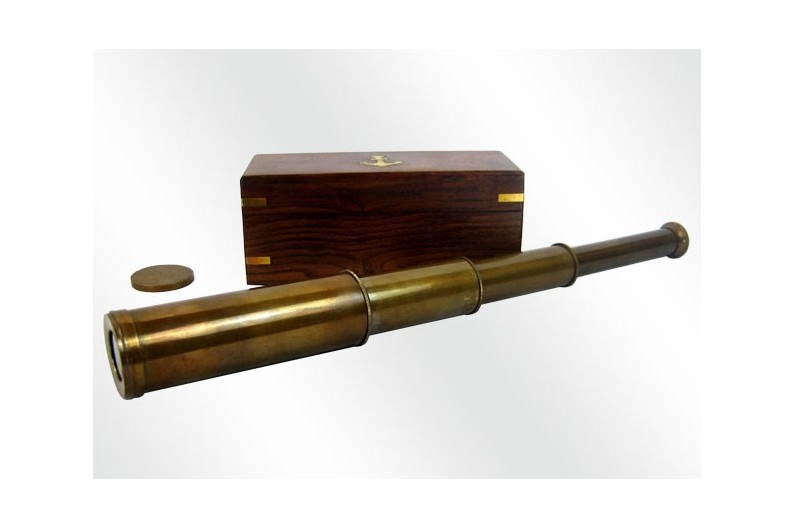 Preciosa réplica de un catalejo antiguo, fabricado en bronce, con tratamiento especial. Incluye caja de madera forrada en el interior, con inscripción de ancla. Una vez extendido el catalejo tiene una longitud de 38 cm. Funciona perfectamente pero su uso debe ser exclusivamente decorativo.