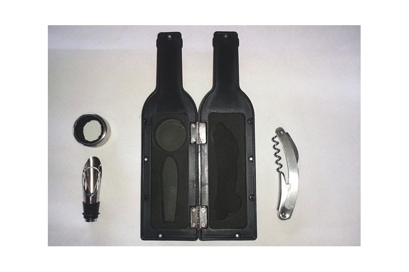 Botella del sommelier "LA CUVEE DU MARIN", compuesta de 3 accesorios para la degustación del vino: un abridor en acero inoxidable, un anillo anti-goteo, un vertedor en metal cromado. La botella tiene cierre imantado y está fabricada de materia plástica