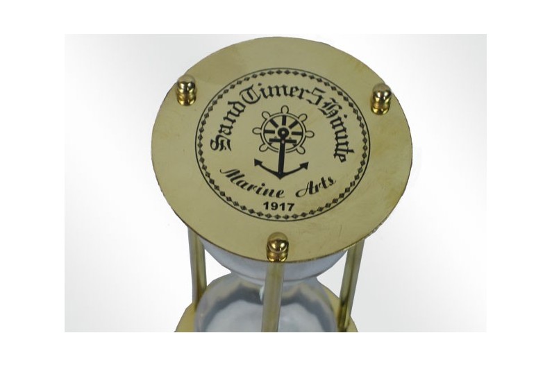 Preciosa réplica de un reloj de arena, fabricado en latón brillante, de arena blanca i duración 5 minutos. Su uso debe ser exclusivamente decorativo.