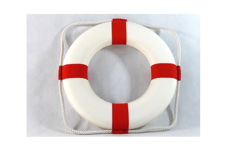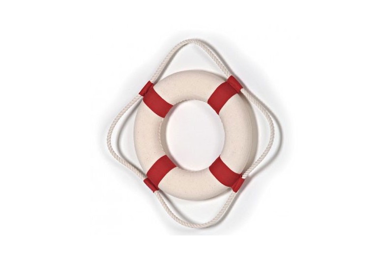 Réplica exacta de un salvavidas, ideal para dar un toque marino a la decoración. Realizado en porexpan en su interior y recubierto de una lona de algodón. La cuerda de algodón atada a su alrededor se utiliza para poder agarrarse.