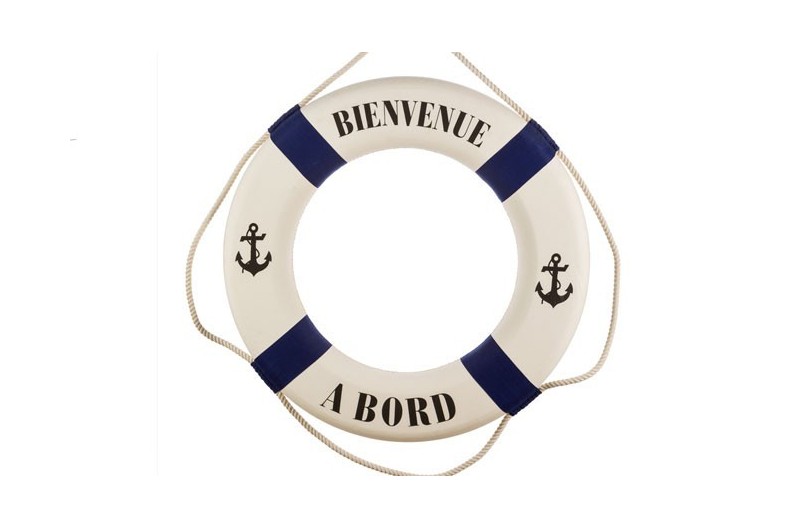 Salvavidas "Bienvenue a Bord" - "Welcome on board" reversible. Réplica exacta de un salvavidas, ideal para dar un toque marino a la decoración. Realizado en porexpan en su interior y recubierto de una lona de algodón. La cuerda de algodón atada a su alrededor se utiliza para poder agarrarse.