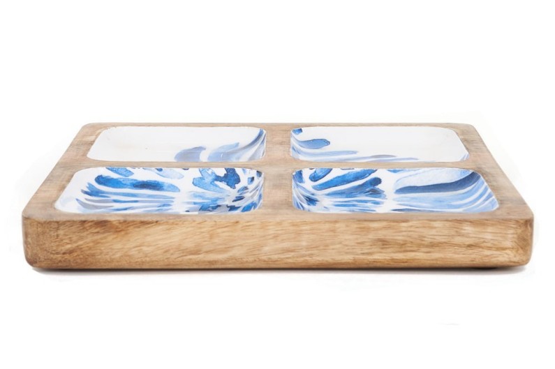 Bandeja de madera y esmalte con imagen azul impresa.