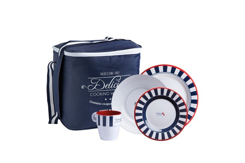 Set de 16 piezas, que incluye: 4 platos planos, 4 platos hondos, 4 platos postre, 4 tazas mug y bolsa de transporte.