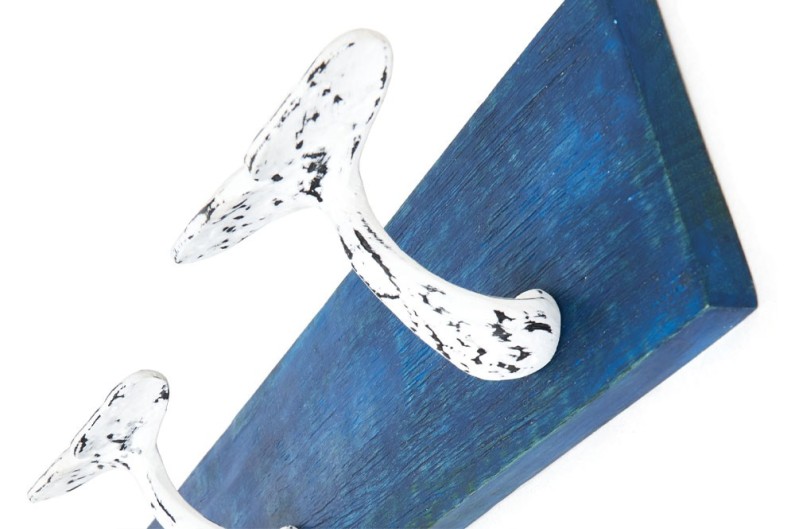 Dangler en forme de queue de poisson aux couleurs vives avec trois cintres en métal pour accrocher des sacs, manteaux et tout ce que vous voulez. Fait de bois et peint à la main.