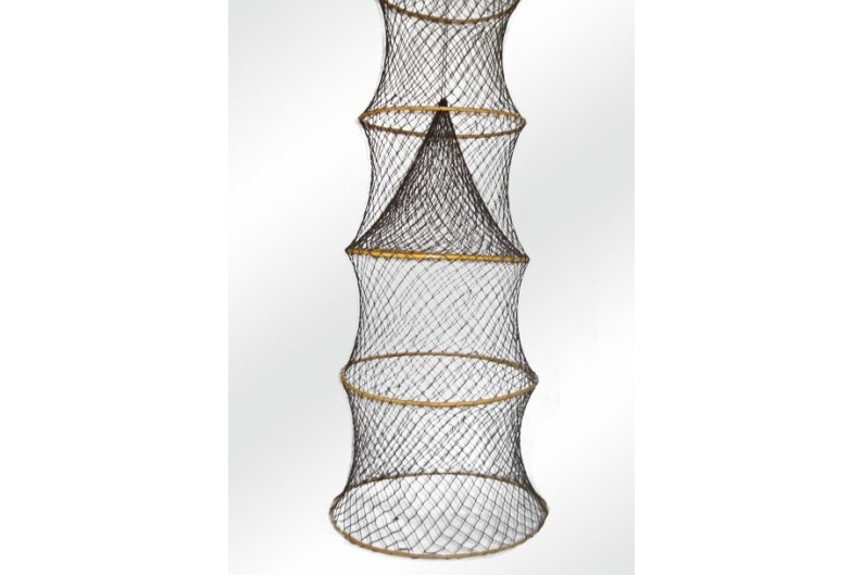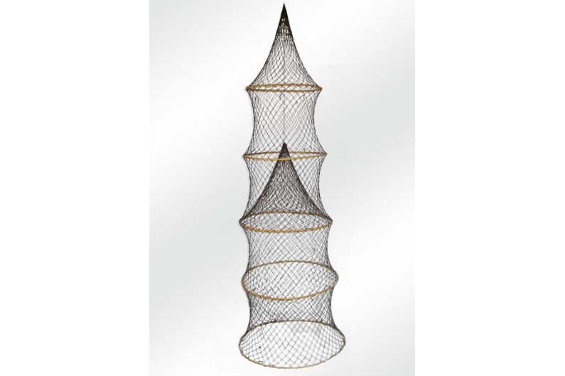 Nasse accordéon faite de filet de pêche et 5 anneaux en osier. Très utilisée dans les étangs, notamment pour la pêche des poissons-chats ainsi qu'en Méditerrannée pour les poissons de fond et les écrevisses. Bel objet décoratif pour créer une ambiance marine.