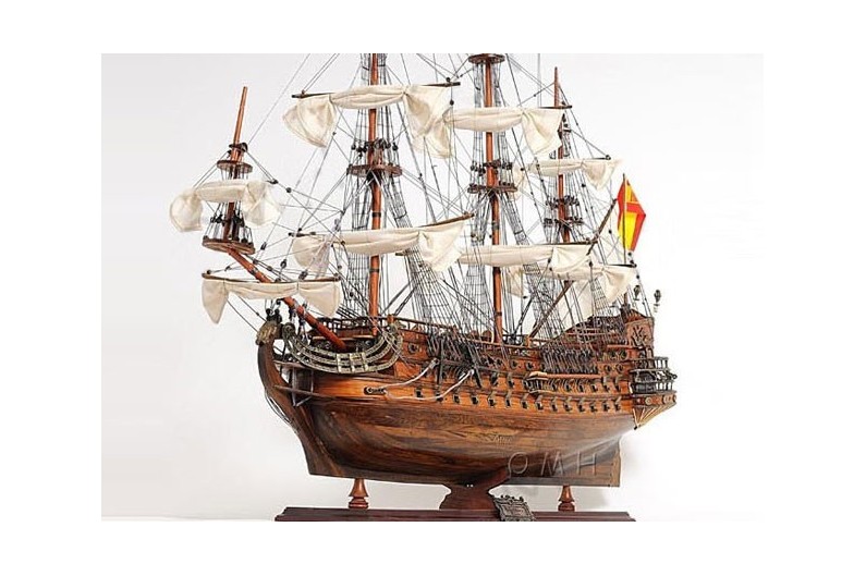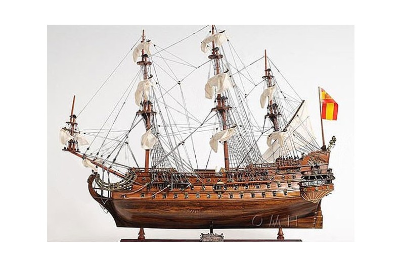 le navire principal de l'Armade Espagnole qui lutta contre les britaniques et les français. Un des premiers navires à 3 ponts, très lourdement armé avec 100 canons, mais d'une ligne élégante. En 1744 il fut endommagé lors d'un affrontement avec les navires britanniques et remorqué à Carthagène. Maquette décorative avec des finissions d'une grande qualité. Travail artisanal. Realisée en bois vernis et entièrement montée.Emballage en boîte individuelle.détails du produit