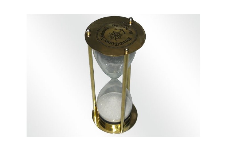 Belle réplique d'un sablier, en laiton poli, sable blanc i durée de 5 minutes. Son utilisation devrait être purement décoratif.