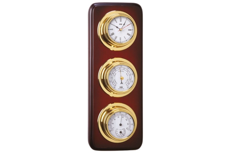 Horloge avec indicateur Bar-Thermo-Hygro, sur socle en bois.