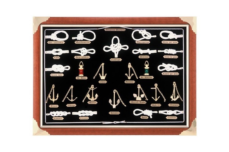 Belle tableau décorative des noeuds marins et des cordes, avec nombreux objets marins. Tableau en bois et protégé par un verre. La corde qui utliza est coton. Chaque nœud porte une plaque avec son nom gravé.
