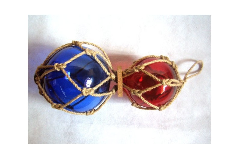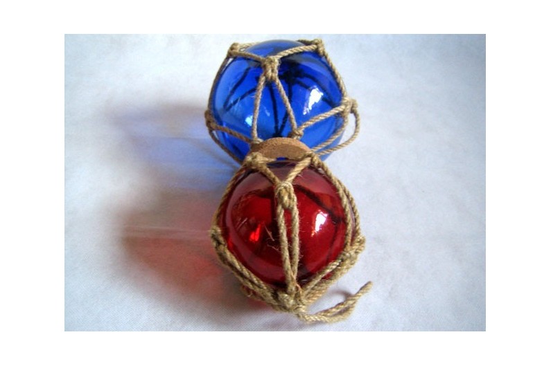 Due boe da pesca blu e rosse. La boa da pesca era un antico galleggiante costituito da una palla di vetro avvolta attorno ad una corda intrecciata. Fu utilizzato fino al 1950. Questi galleggianti erano attaccati alle reti da pesca in modo che rimanessero in superficie mentre andavano alla deriva nella corrente. Oggetto che darà un tocco marino decorativo.