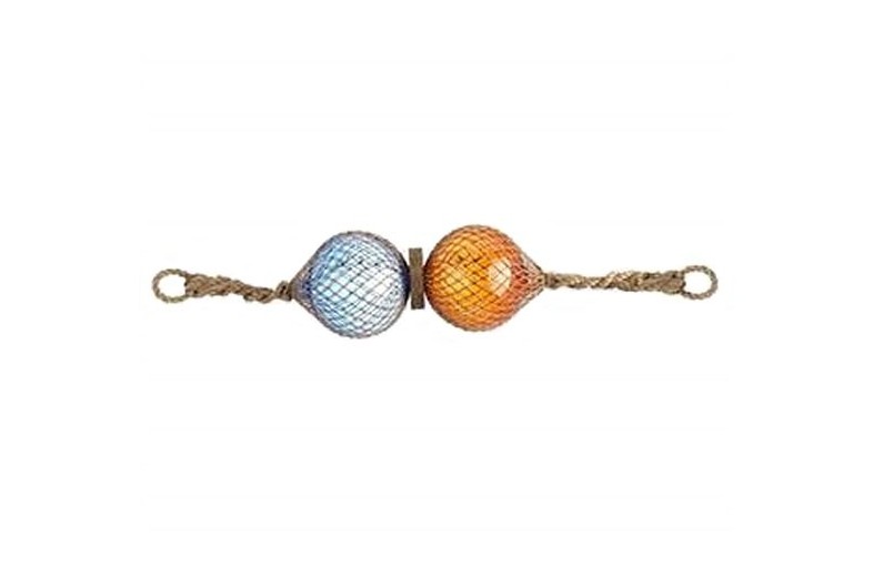 Boa da pesca blu e arancione. La boa da pesca era un antico galleggiante costituito da una palla di vetro avvolta attorno ad una corda intrecciata. Fu utilizzato fino al 1950. Questi galleggianti erano attaccati alle reti da pesca in modo che rimanessero in superficie mentre andavano alla deriva nella corrente. Oggetto che darà un tocco marino decorativo.