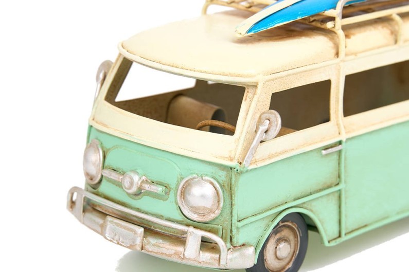 Bellissimo modello di un vecchio furgone degli anni '70, il tipico furgone tipo 'Volkswagen', con la tavola da surf, pronto per andare in spiaggia.
