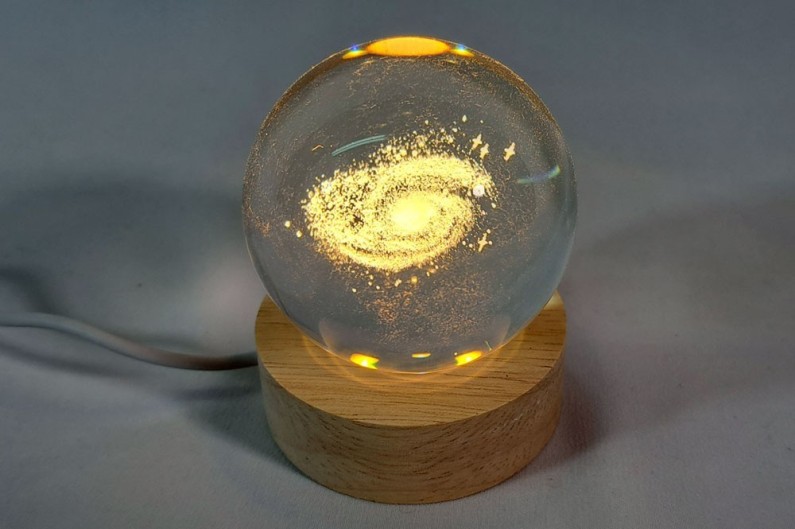 Luce led che illumina una sfera astronomica trasparente. Include la sfera di vetro, la base led e il cavo USB.
