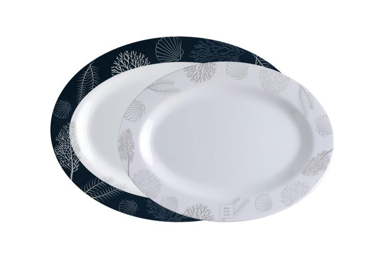Set di due vassoi, bel design, sfondo blu. Misure: 35x25,5 cm / 30x22,5 cm.