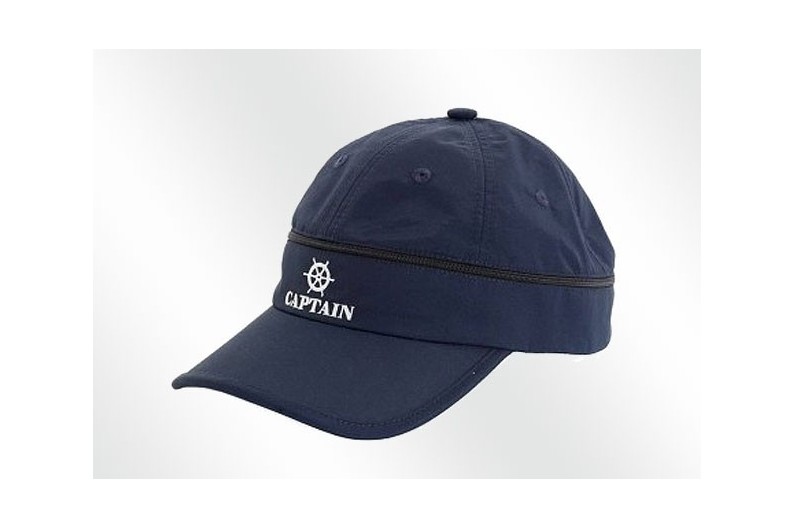 Cappello del capitano in blu, con logo del capitano ricamato in bianco. Progettato con aperture di ventilazione che garantiscono l'aerazione della testa. Ha anche un sistema di cerniere per separare la parte superiore del cappuccio e diventare Visiera Regolabile sul retro.