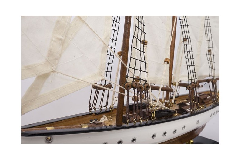Modello di nave Atlantic (1903), una goletta a tre alberi progettata da William Gardner. Finì come nave scuola per la Guardia Costiera degli Stati Uniti. Il modello è realizzato e dipinto a mano. Il palo viene smontato per il trasporto.