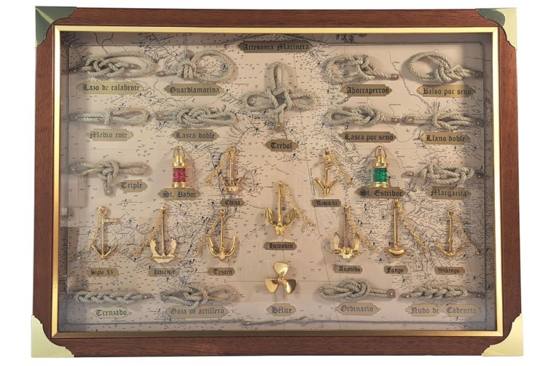 Bellissimo quadro decorativo di nodi marinari e corda, con numerosi oggetti nautici. Con cornice in legno e protetto con un vetro. La corda utilizzata è di cotone. Ogni nodo ha una targa con inciso il suo nome.