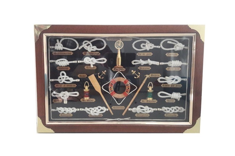 Bellissimo quadro decorativo di nodi marinari e corda, con numerosi oggetti nautici. Con cornice in legno e protetto con un vetro. La corda utilizzata è di cotone. Ogni nodo ha una targa con inciso il suo nome.