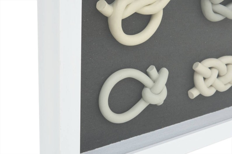 Prestigioso dipinto marino. Sullo sfondo nero si vedono diversi nodi da marinaio. Telaio in legno massello verniciato bianco. Ogni nodo viene realizzato tradizionalmente secondo le tradizioni marinare.