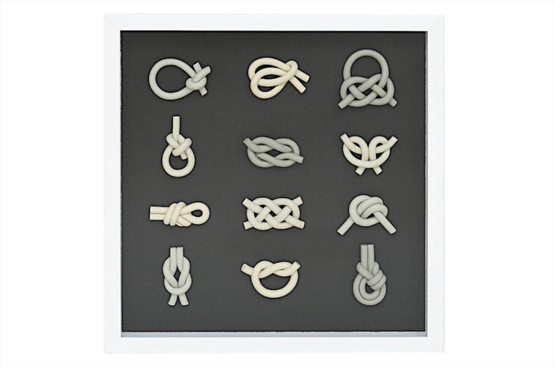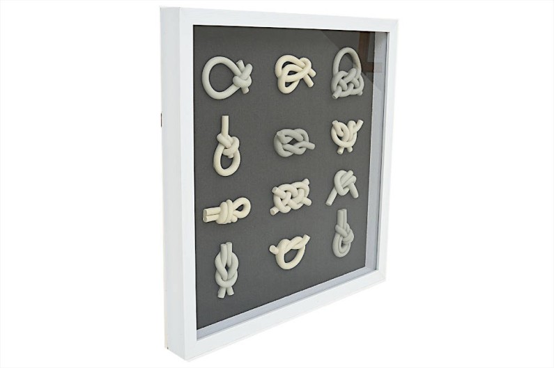 Bellissimo dipinto raffigurante un nodo nautico. Con sfondo nero e cornice in legno dipinta di bianco. Ciascuno dei nodi è realizzato sinteticamente.