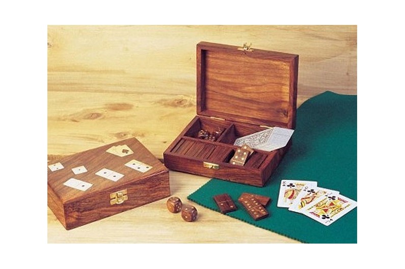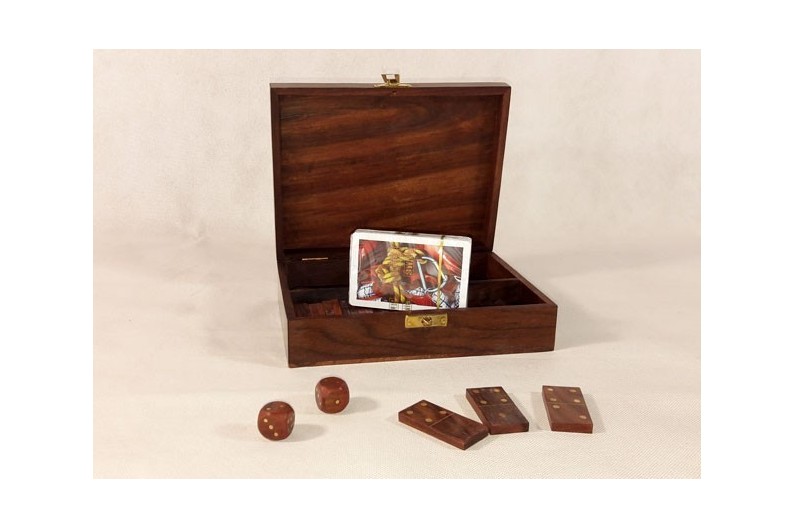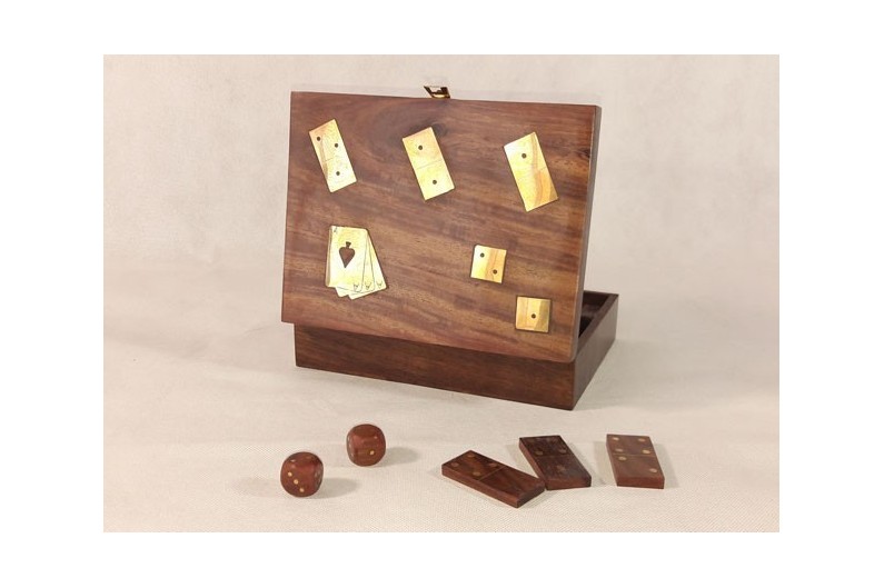 Ottimo set di carte da gioco, domino e dadi in una scatola di legno decorata in ottone. Ottimo regalo per divertirsi.