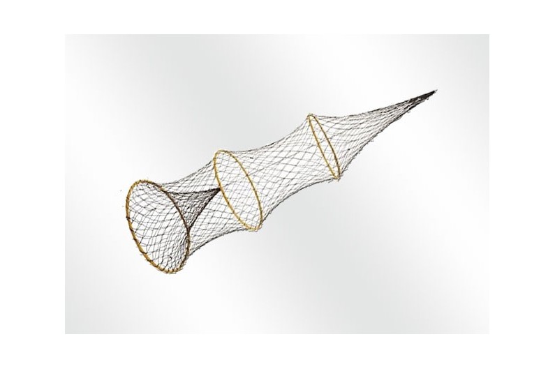 Naso a fisarmonica realizzato con rete da pesca e 5 anelli in vimini. Ampiamente usato negli stagni, in particolare per la pesca al siluro e nel Mediterraneo per pesci di fondo e granchi. Bellissimo oggetto decorativo per creare un'atmosfera marina.