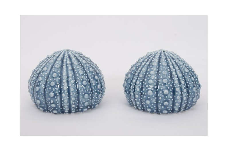 Sale e pepiera in ceramica a forma di riccio di mare.
