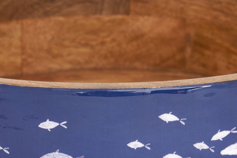 Ciotola realizzata in legno di bambù e smaltata all'interno con pesce stampato.