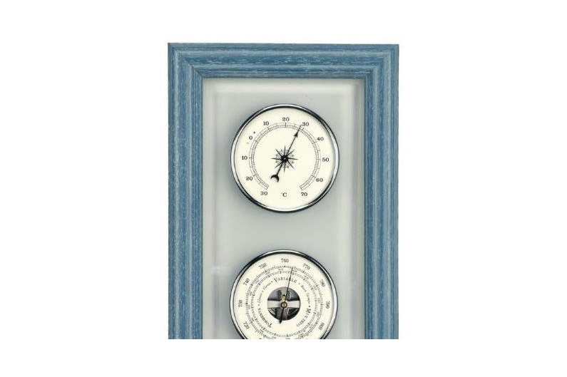 Stazione metereologica. Ha umidità, pressione atmosferica e temperatura, potendo fare previsioni meteo di base per tutti i navigatori. Sono montati su un telaio di legno.