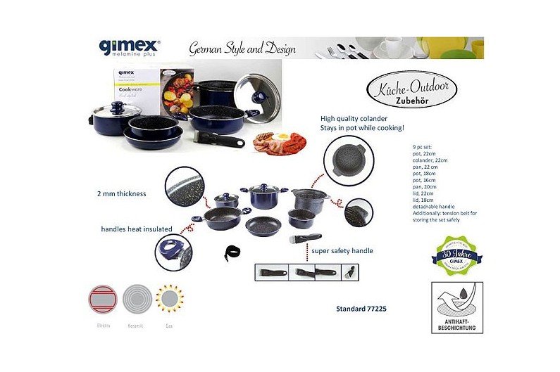 Bateria de cozinha azul marinho de alta qualidade fabricada em alumínio leve com revestimento antiaderente. Todos os artigos são feitos de material de pelo menos 2 mm de espessura e de alta qualidade. A pega removível tem uma trava de segurança para impedir a abertura acidental da marca GIMEX.