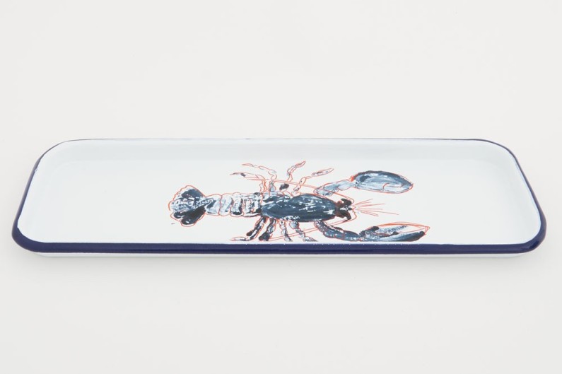 Bandeja em metal esmaltado branco, com lagosta estampada.