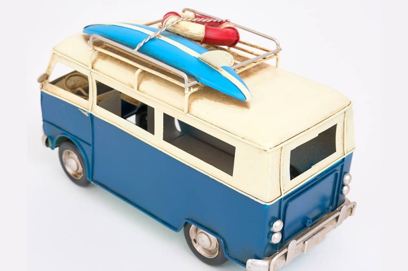 Bonito modelo de uma carrinha antiga dos anos 70, do tipo típico "Volkswagen", com a prancha de surf, pronta para ir à praia.