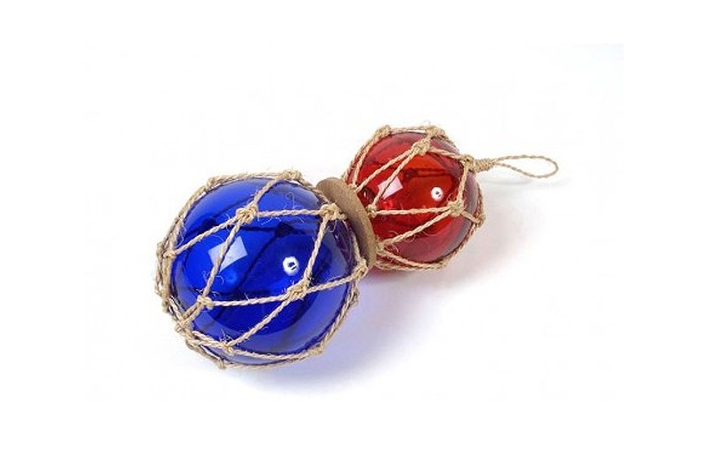 Duas bóias azuis e vermelhas de pesca. A bóia de pesca era um velho carro alegórico que consiste em uma esfera de vidro envolto em uma corda trançada. Foi usado até a década de 50. Tal foi fixado em flutuadores de redes de pesca para que eles permaneçam na superfície como eles andaram a jusante.