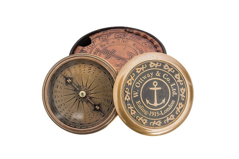 Bússola dourada envelhecida com estojo de couro. História du Compass