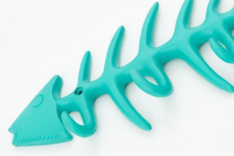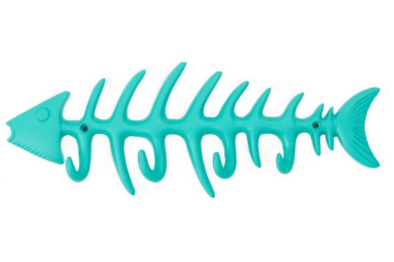 Cabide em forma de espinha de peixe, em metal e cor azul o verde.