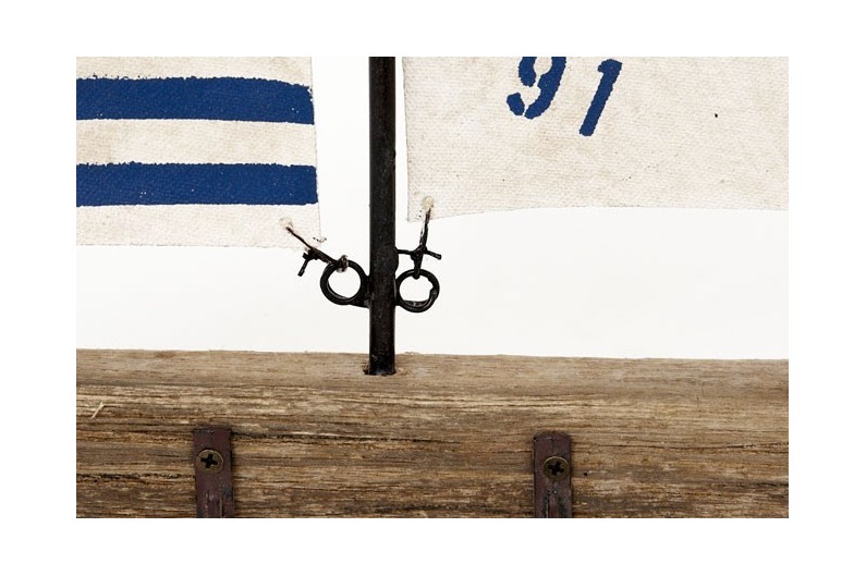 Cabide chaves em forma de veleiro, feito à mão de madeira, aço e com velas de algodão.