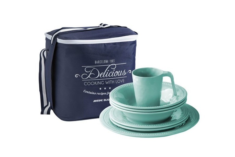 Conjunto de 16 peças, incluindo: 4 pratos rasos, 4 pratos fundo, 4 pratos de sobremesa, 4 taças mais saco de transporte. Série Acqua.