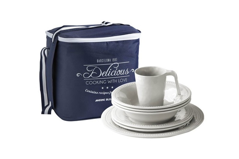 Conjunto de 24 peças, incluindo: 6 pratos rasos, 6 pratos fundo, 6 pratos de sobremesa, 6 xícaras mais saco de transporte. Série Perla.