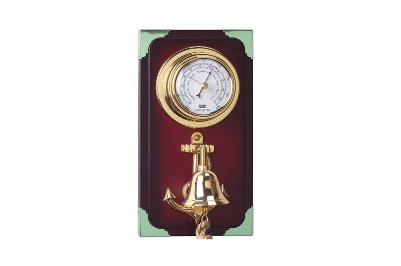 Barômetro. Indica a pressão atmosférica. O instrumento de medição é metálico. Ele é montado em uma base de madeira. Uso preferencial interior.