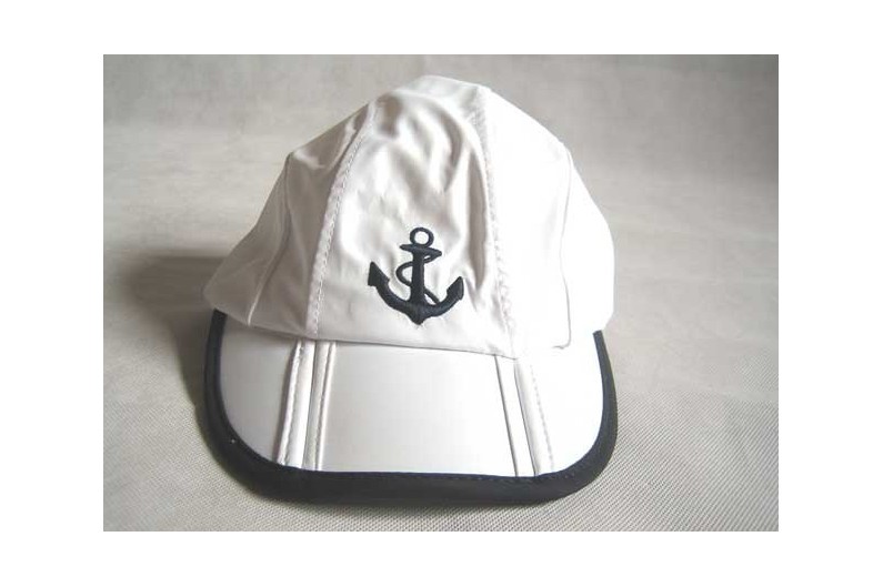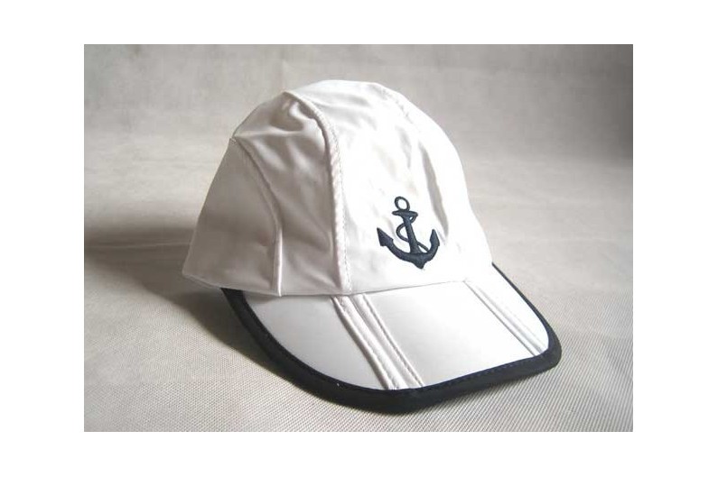 Boné do marinheiro branco com bordado logotipo da âncora azul. Projetado com aberturas para garantir a aeração da cabeça. Ele também tem uma cremalheira para remover a parte superior da tampa e tornar-se viseira. Traseira ajustável.