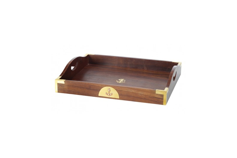 Bandeja estilo marinheiro feita demadeira com bordas elevadas, incorporado uma bela âncora e cantos de latão.