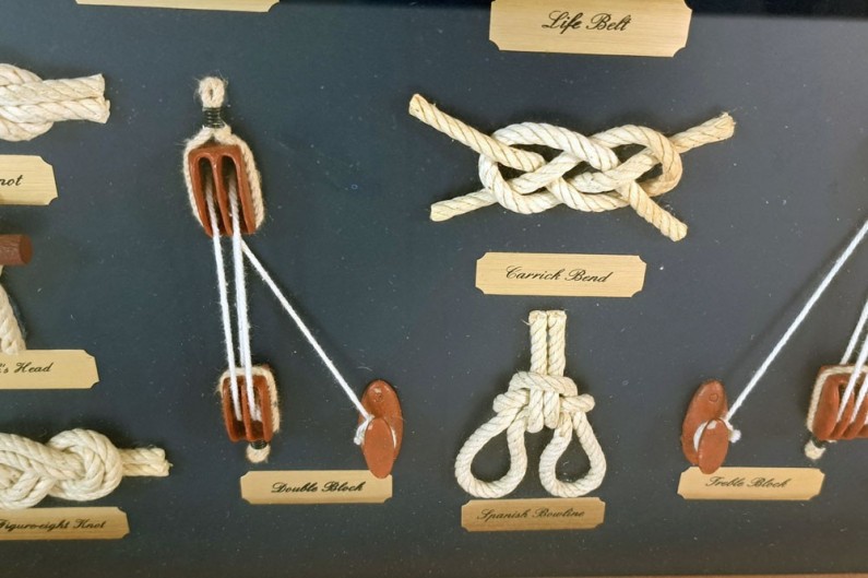 Bonito quadro decorativo de nós marinheiros e cordas, com numerosos artigos náuticos. Com moldura de madeira e protegida com um vidro. A corda usada é de algodão. Cada nó tem uma placa com o seu nome gravado.