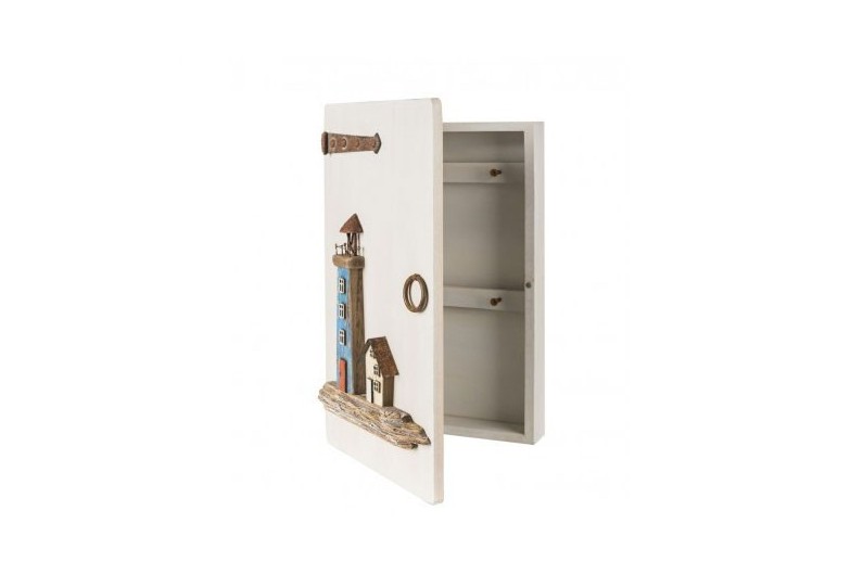 Armário chave para pendurar chaves, feito de madeira com fecho magnético. A porta é decorado com motivos de marinheiro.
