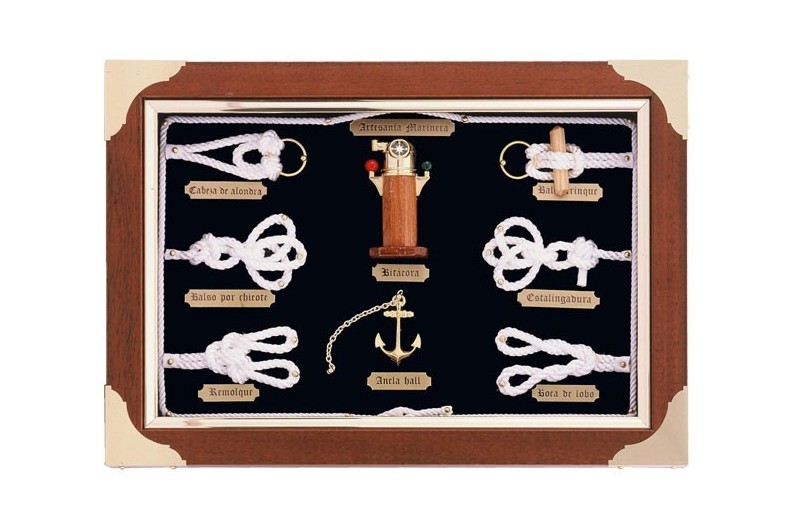 Bonito quadro decorativo de nós marinheiros e cordas, com numerosos artigos náuticos. Com moldura de madeira e protegida com um vidro. A corda usada é de algodão. Cada nó tem uma placa com o seu nome gravado.