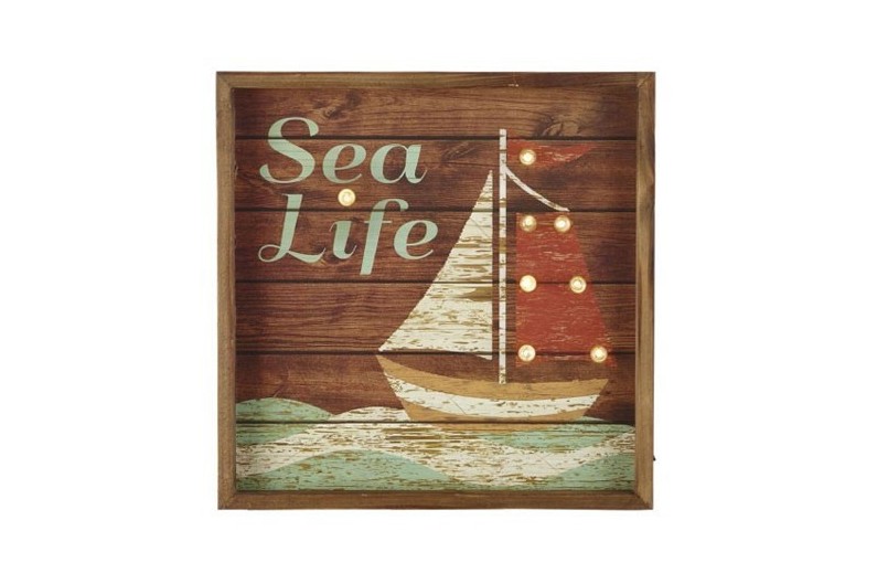Tabela marinheiro de madeira decorativo de uma caixa de pesca com bote.